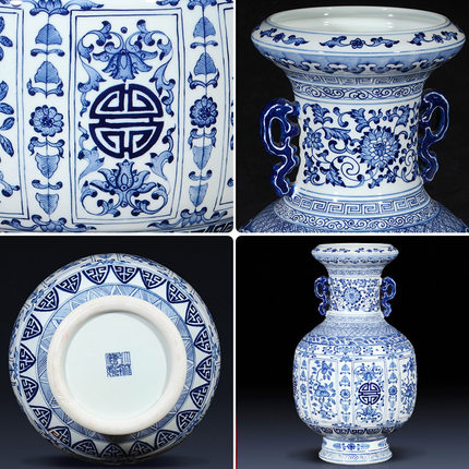 Hand-painted blue and white porcelain floor large ceramic double ear vase